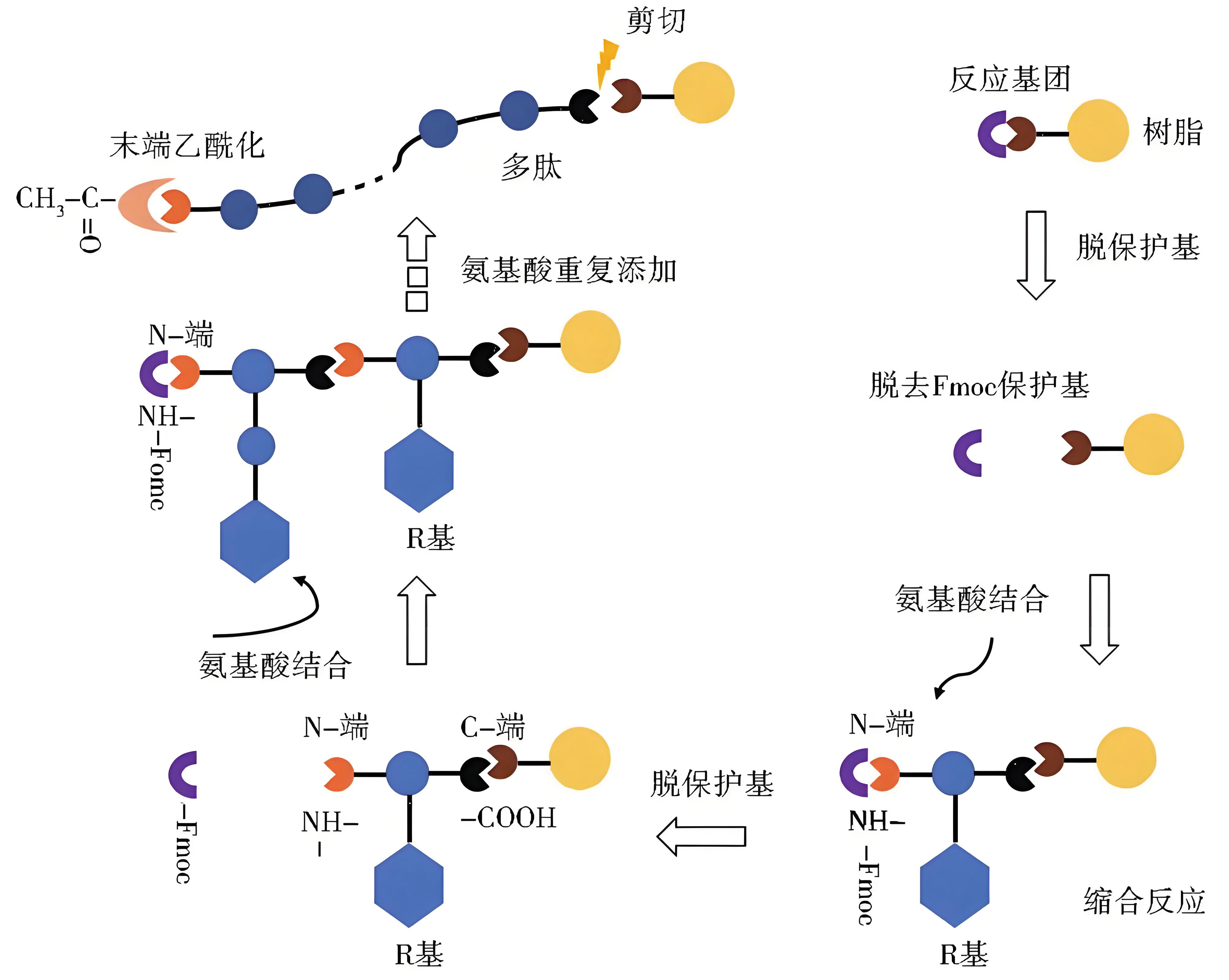 每轮反应包括:脱保护(去除Fmoc或Boc基团)→ 活化与偶联 → 洗涤 → 封端(可选)等步骤,循环往复直至目标序列完成,最后通过裂解将多肽从树脂上释放并纯化。